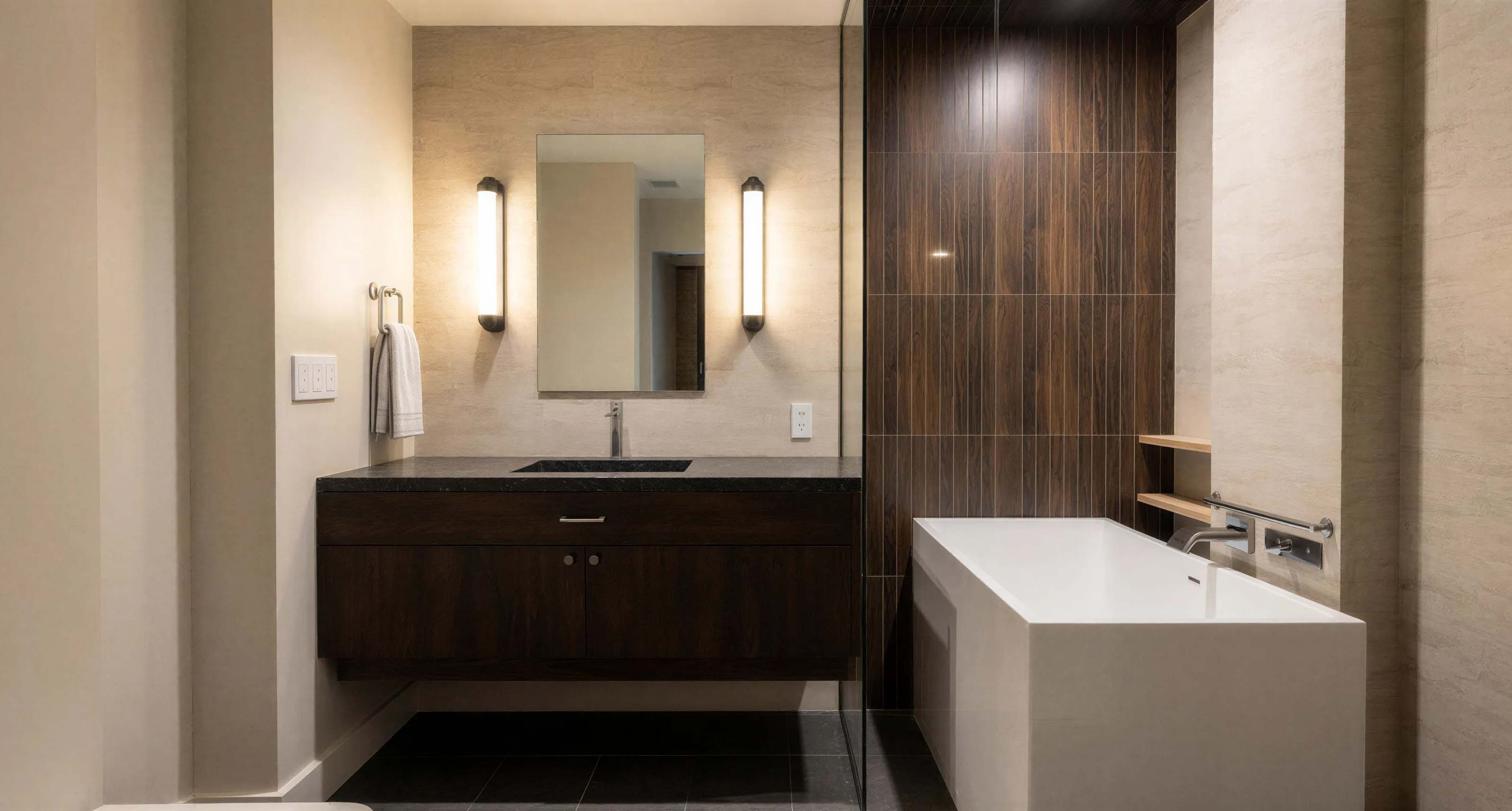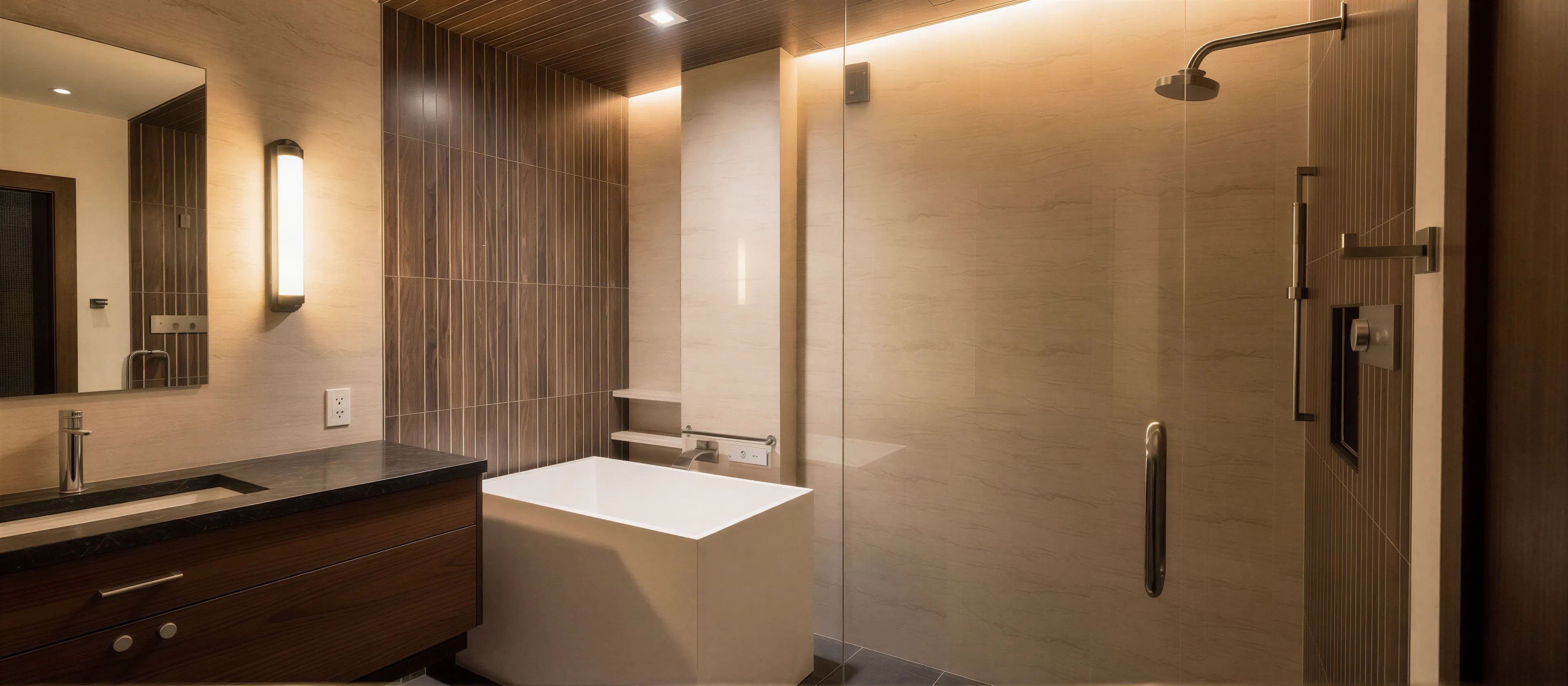 Large-format tile creates a continuous visual surface that allows the space to feel expansive and uncluttered. Warm wood tones soften the stone surfaces, while subtle lighting highlights texture and architectural detail.